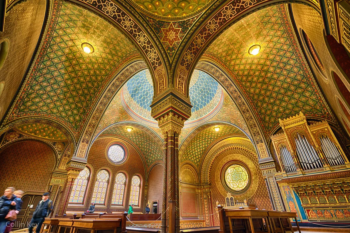 - Name: Spanish Synagogue Interior Type: sight Why go: See the most beautiful synagogue interior in Europe. The gold stucco work is breathtaking. Best for: Architecture fans Where: Vězeňská 1, Josefov Time: 45 minutes Cost: Included in Jewish Museum pass Getting there: Walk from Old Town Square Tip: Look up at the central dome for the best photo angle.